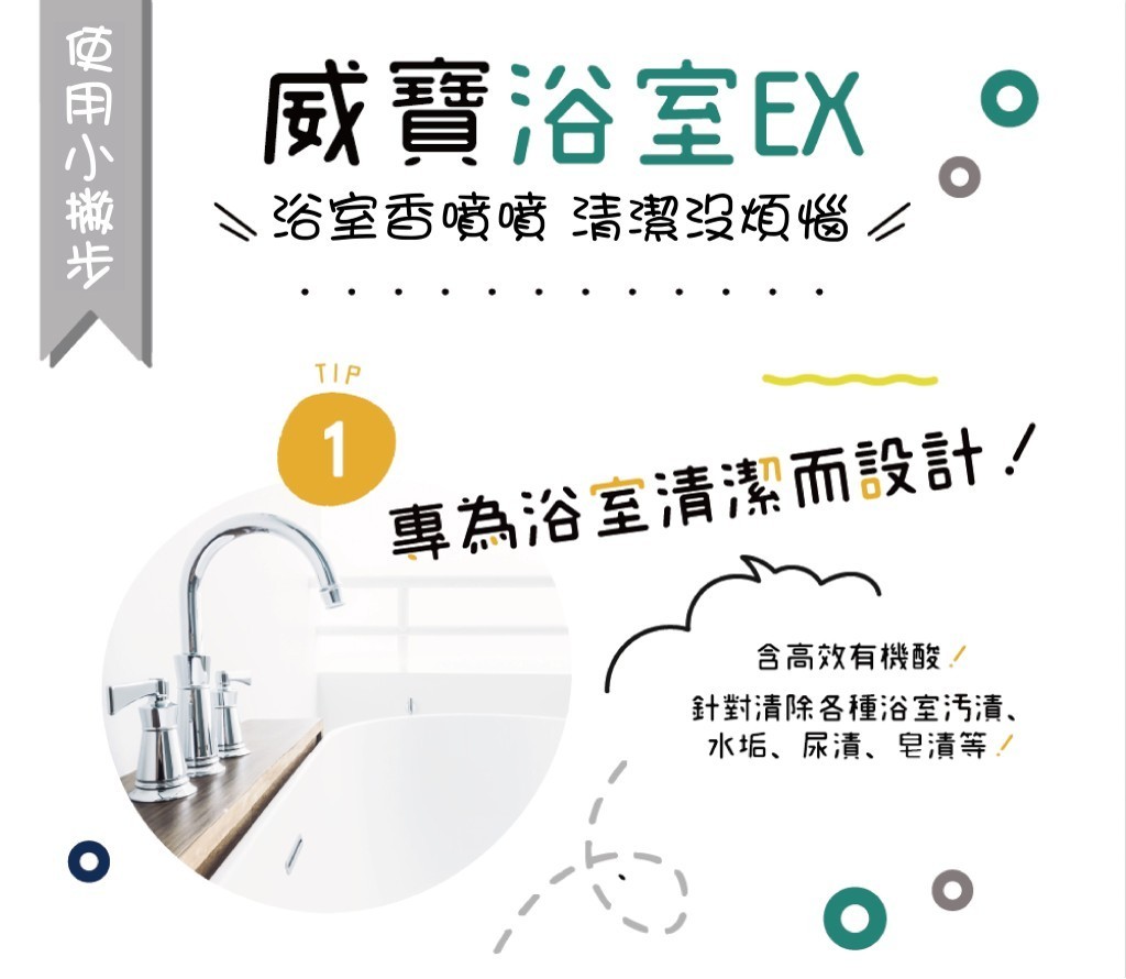 專為浴室清潔而設計的 EX 潔淨配方, 含高效有機酸針對清除各種浴室污漬、水垢、尿漬、皂漬等