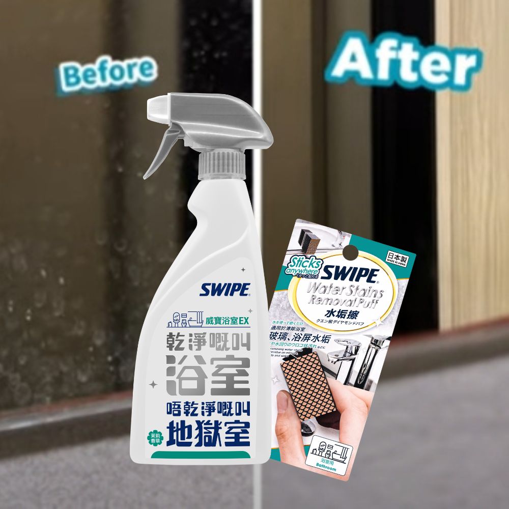 2. 強烈建議使用SWIPE EX浴室清潔劑,將要清潔的表面及水垢擦研磨表面噴濕,並避免乾擦表面。